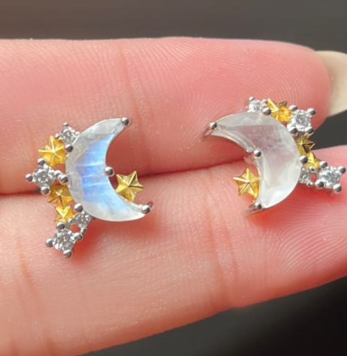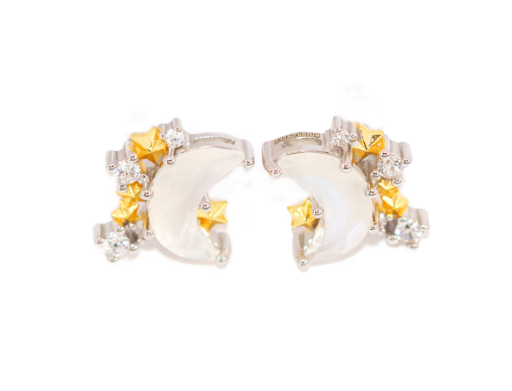 Shine as brilliantly as the moon and stars in the night sky with the Moonlet Stud Earrings! Each crescent moon is cut from gleaming moonstone, complemented by shimmering cubic zirconia stones that are sure to bring your cosmic look to the next level. Made of sterling silver .925, this piece is also plated in 14Kt yellow gold and rhodium for extra shine.