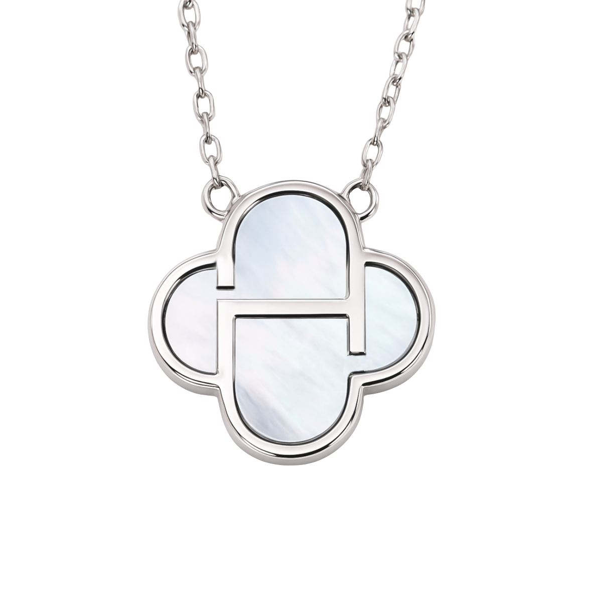 This pendant is made with a mother pearl shell in sterling silver .925 plated in rhodium or 14kt Yellow gold. It comes with a 16+ 2 inch chain.