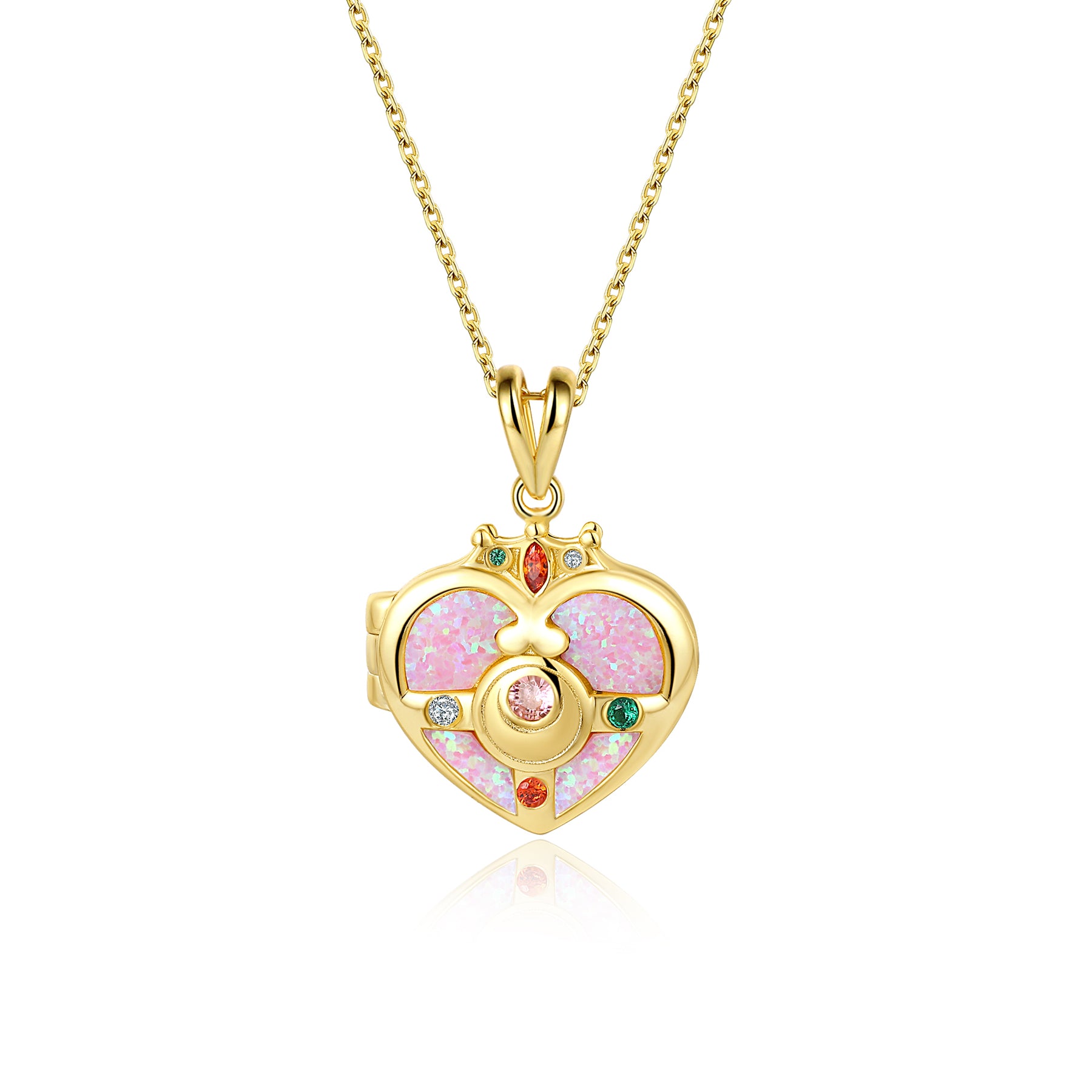 Unleash your inner magical girl and show off your glittering transformation with the Cosmic Heart Locket! With beautiful pink opal inlays and sparkling cubic zirconia stones, this piece is sure to turn heads and make a perfect match for your magical girl ensemble! Crafted from sterling silver .925 plated in 14K yellow gold, the locket measures 2 cm in length and comes with a complementary 18 -inch gold chain.
