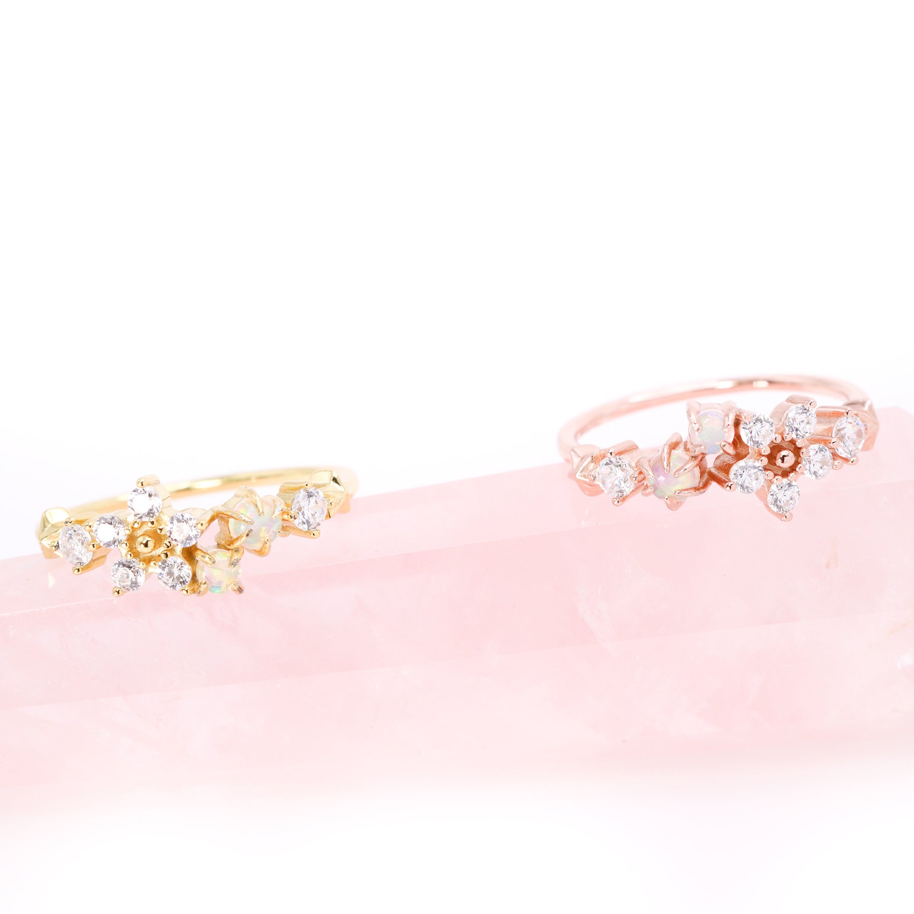 Ophelia is a dainty band of sterling silver .925 plated in gold. She features cz and synthetic opal stones in the shape of a tiny flower along with celestial details.