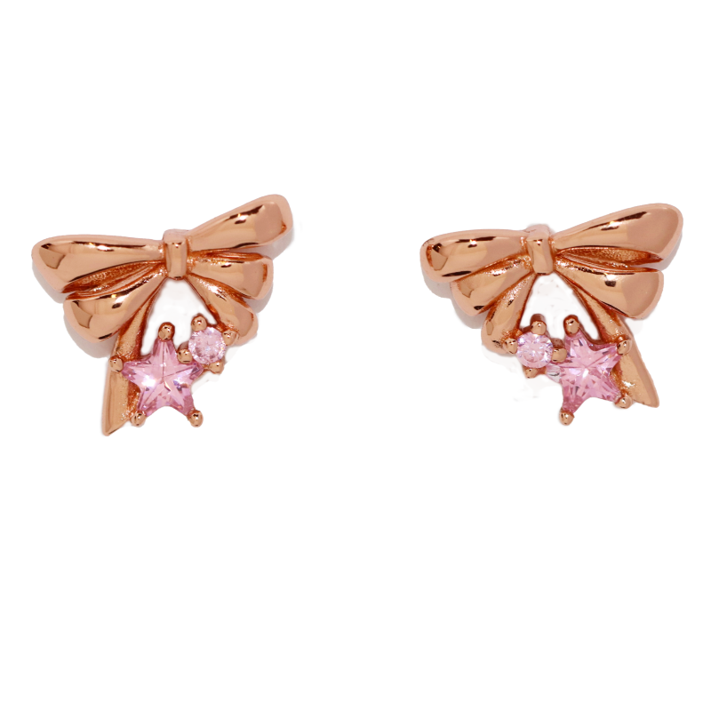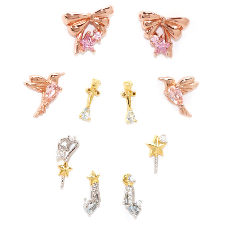 The day in the life of a fairytale princess isn’t easy, but it sure is full of adventure, romance, and magic! The Fairytale Princess Stud Pack features five sets of studs, each resembling a critical component of fairytale princess life. From speaking with songbirds in the morning, meeting our fairy godmother and her magic wands in the evening, to losing our precious glass slippers at midnight, we do this all dressed prettily in pink ribbons and equipped with elegant rose daggers — because we never know what evil stepmothers may send after us! Each pair of studs is crafted from sterling silver .925 plated in rhodium, 14Kt yellow gold, and 14Kt rose gold, and dazzles the beholder with beautiful cubic zirconia stones.